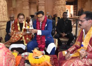 ભક્તિ, ભવ્યતા અને દિવ્યતાના પ્રતિક સમા પ્રથમ જ્યોતિર્લિંગ સોમનાથ મંદિરમાં સુરીનામના રાષ્ટ્રપતિ ચંદ્રિકાપ્રસાદ સંતોખીએ દેવાધિદેવ મહાદેવ સમક્ષ શીશ ઝૂકાવ્યું હતું. આ ઉપરાંત તેમણે મહાદેવ સમક્ષ ગંગાજળનો જળાભિષેક અર્પણ કર્યા બાદ પૂજન-અર્ચન કરી ધન્યતા અનુભવી હતી. આ પહેલાં લઘુ-સુક્ષ્મ અને મધ્યમ ઉદ્યોગ તેમજ સહકાર મંત્રી જગદિશભાઈ વિશ્વકર્મા સહિત મહાનુભાવોએ ગીતામંદિર હેલિપેડ પર રાષ્ટ્રપતિનું ઉષ્માભેર સ્વાગત કર્યું હતું.