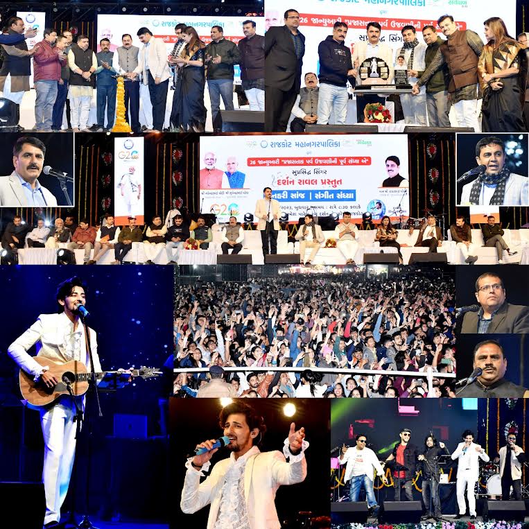 પ્રજાસત્તાક પર્વની પૂર્વ સંધ્યાએ રાજકોટ મહાનગરપાલિકા દ્વારા સુપ્રસિધ્ધ પ્લેબેક સિંગર દર્શન રાવલ દ્વારા પ્રસ્તુત ‘સુનહરી સાંજ’ મ્યુઝીકલ નાઈટનું કવિ રમેશ પારેખ ખાતે આયોજન કરવામાં આવ્યું હતું. આ કાર્યક્રમના અધ્યક્ષ અને ઉદ્ઘાટક ગુજરાત વિધાનસભાના અધ્યક્ષ શંકરભાઈ ચૌધરી, મેયર ડૉ.પ્રદીપ ડવની પ્રેરક ઉપસ્થિતમાં યોજાયેલ. આ પ્રસંગે રાજ્યસભાના સાંસદ રામભાઈ મોકરીયા, શહેર ભાજપ અધ્યક્ષ કમલેશભાઈ મીરાણી, ધારાસભ્ય ઉદયભાઈ કાનગડ, દર્શીતાબેન શાહ, રમેશભાઈ ટીલાળા, મેયર ડૉ. પ્રદીપભાઈ ડવ, સ્ટેન્ડીંગ કમીટી ચેરમેન પુષ્કરભાઇ પટેલ, ગુજરાત મ્યુનિસિપલ ફાઈનાન્સ બોર્ડના પૂર્વ ચેરમેન ધનસુખભાઈ ભંડેરી, મ્યુનિસિપલ કમિશનર અમિત અરોરા, શહેર ભાજપ મહામંત્રી જીતુભાઈ કોઠારી તથા નરેન્દ્રસિંહ ઠાકુર, શક્તિમાન ઇન્ડસ્ટ્રીઝના હસુભાઈ ગોહેલ, પ્રશાંત કાસ્ટિંગના શંભુભાઈ પરસાણા, સ્વાગત ગ્રુપના છગનભાઇ બુસા, શાસક પક્ષ નેતા વિનુભાઈ ઘવા, શાસક પક્ષ દંડક સુરેન્દ્રસિંહ વાળા, સમાજ કલ્યાણ સમિતિના ચેરમેન પરેશભાઈ પીપળીયા તથા નાયબ મ્યુનિસિપલ કમિશનર આશિષ કુમાર તથા સી.કે. નંદાણી તેમજ મહાનગરપાલિકાની વિવિધ કમિટીના ચેરમેનઓ, કોર્પોરેટરઓ તથા અધિકારીઓ ઉપસ્થિત હતા.