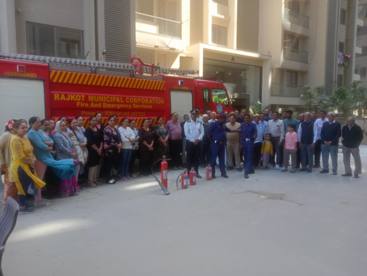 રાજકોટ મહાનગર પાલિકા ફાયર અને ઈમરજન્સી સર્વિસીઝ દ્વારા રાજકોટ શહેર વિસ્તારમાં આવેલ હાઇરાઇઝ બિલ્ડીંગમાં લગાવવામાં આવતી ફાયર સેફટીના સાધનો જે બિલ્ડીંગમાં રહેતા લોકોને જાગૃતી માટે તા.૦૧/૦૨/૨૦૨૩ ના રોજ (૧) સ્પીડવેલ પાર્ટી પ્લોટ પાસે ફોર્ચ્યુન સુલેસટિયા અને તા.૦૨/૦૨/૨૦૨૩ ના રોજ (૨) કીંગ લેન્ડ એપાર્ટમેન્ટ, અમિન માર્ગ શહેરની રેસીડેન્સીયલ બિલ્ડીંગ ખાતે ચીફ ફાયર ઓફીસર આઇ.વી.ખેર અને ડે.ચીફ ફાયર ઓફીસર બી. જે. ઠેબાના માર્ગદર્શન હેઠળ ફાયર સેફટી અંગે મોકડ્રીલનું આયોજન કરવામાં આવેલ હતું. આ બાબતે વધુને વધુ લોકો ભાગીદાર થાય અને ફાયર સેફટીની તાલીમ મેળવે જેથી આપણા ગૌરવશાળી રાજકોટ ને વધુ વધુ સુરક્ષીત બનાવવા આગળ આવે તેવો જાહેર જનતાને અનુરોધ કરવામા આવે છે. જે બિલ્ડીંગ દ્વારા પોતાની બિલ્ડીંગમાં મોકડ્રીલ આયોજન કરવા સ્વેચ્છીક અરજી કરશે તેમને પહેલી તક આપવામાં આવશે.