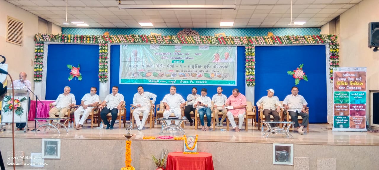 ધોળકા સ્વામીનારાયણ મંદિર મુકામે ખેતીવાડી શાખા દ્વારા આંતરરાષ્ટ્રીય મીલેટ્સ વર્ષ 2023 અંતર્ગત તાલુકા કક્ષાનો મિલેટસ્ મેળો તથા પ્રાકૃતિક ખેતી અનુસંધાને પરિસંવાદ યોજાયો. જેમાં મુખ્ય અતિથિ તરીકે ધોળકા નાં ધારાસભ્ય કિરીટસિંહ ડાભી, એપીએમસીના ચેરમેન પ્રવિણસિંહ ડાભી, જિલ્લાના આરોગ્ય સમિતિના ચેરમેન ગોવિંદભાઈ મકવાણા તેમજ તાલુકા અને નગરપાલીકાના હોદેદારો, ખેતીવાડી નિયામક ખાસ ઉપસ્થિત રહ્યા હતા. આણંદ કૃષિ યુનિવર્સિટીના વૈજ્ઞાનિક હિનાબૈન દ્વારા ખુબ સરસ વક્તવ્ય આપ્યું હતું. મોટી સંખ્યામાં ઉપસ્થિત ભાઈઓ અને બહેનોને પ્રાકૃતિક ખેતી તરફ વાળવા માટે ભગીરથ પ્રયત્નો કરવામાં આવ્યા.