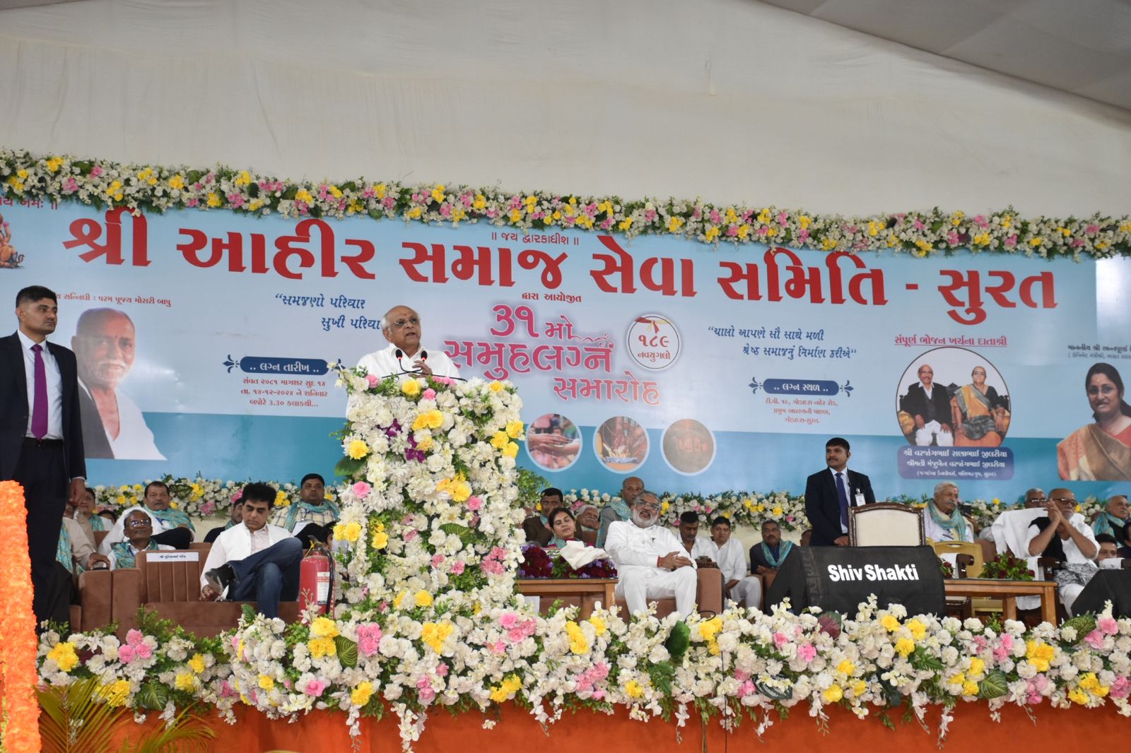 મુખ્યમંત્રી ભૂપેન્દ્ર પટેલે સુરત શહેરના ગોડાદરા ખાતે સુરત આહિર સમાજ સેવા સમિતિ દ્વારા આયોજિત ૩૧માં સમૂહલગ્ન સમારોહમાં સહભાગી થઈ ૧૮૯ નવયુગલોને આશીર્વચન આપ્યા હતા. મુખ્યમંત્રીએ પ્રભુતામાં પગલા પાડનારા નવદંપતિઓ લગ્ન જીવનમાં એકબીજાનો સહારો બની એકબીજાના સુખે સુખી થઈને સધિયારો આપી જીવન ઉજળુ બનાવે તેવી શુભકાનાઓ પાઠવી હતી. મુખ્યમંત્રી ભૂપેન્દ્રભાઈ પટેલે જણાવ્યું હતું કે, આહિર સમાજનો દિવ્ય અને ભવ્ય ગૌરવવંતો ઈતિહાસ રહેલો છે. સમાજને જયાં પણ જરૂર હશે ત્યા સરકાર તેમની સાથે હોવાનુ જણાવીને શિક્ષણથી લઈને અનેકક્ષેત્રોમાં સમાજ આગળ વધી રહ્યો છે. દરેક સમાજ સમુહલગ્નમાં જોડાયો છે. લગ્નમાં જોડાનાર પરિવારને આર્થિક બચત થતી હોય છે જે નાણા બાળકોના શિક્ષણ, આરોગ્ય પાછળ ખર્ચ કરી શકતો હોવાનું તેમણે જણાવ્યું હતું.