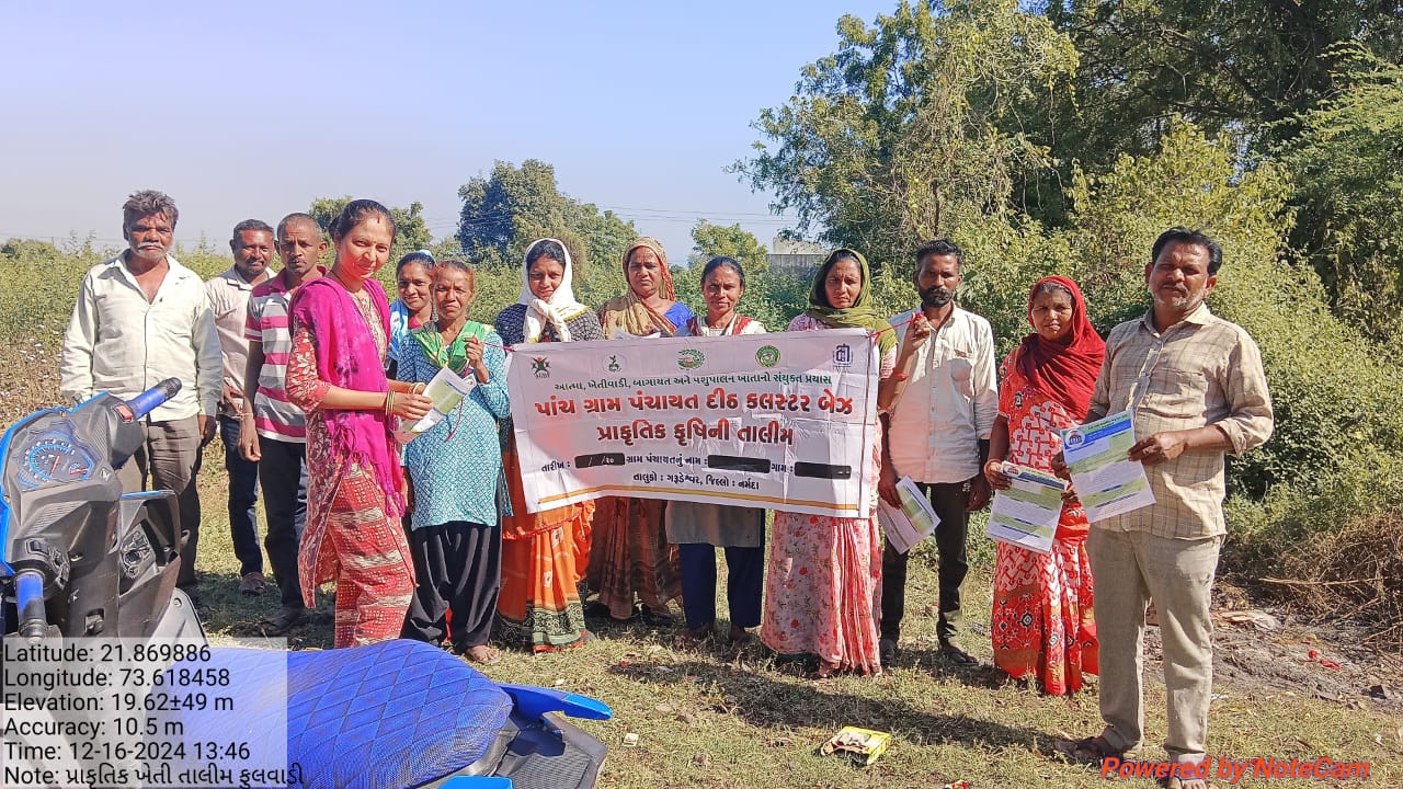 નર્મદા જિલ્લાના પાંચે તાલુકામાં તા. ૯ મી થી ૧૭ ડિસેમ્બર દરમિયાન દેડિયાપાડા તાલુકાના પાનુડા, સોલીયા, સામોટ, નાનાસુકા આંબા, સાબુટી, રેલવા, ખૈડીપાડા, રોહદા, વાડવા, તાબદા, કુનબાર, નવાગામ, ઘાંટોલી, સુકવાલ, બેસણા, બાબદા, ઝાંક, ગવલાવાડી, પાટડી, ગોપલિયા, બોગજ, નિવાલ્દા,ચુલી, ભાટપુર, કાબરીપઠાર, મોસીટ, કેવડી, સમારપાડા, ચિકદા, મેડિયું સાગ, કુંડીઆંબા, પાનુડા, પાટડી, દેવજી ફળિયા. તિલકવાડા તાલુકાના નમારિયા, વ્યાધર, ફતેપુરા વણ, કોયારી, લીમપુરા, ભાદરવા, બુજેઠા, ચૂડેશ્વર, મોટી કામસોલી, જેતપુર, લીલગઢ, ઝાઝપુરા, ઉંધઇમાડવા, કાદલેજ, ઉંમેદ્પુરા, ગેગડીયા, ગમોડ, વરવાડા, નલિયા, સાવલી, ફતહેપુર (વજી), જલોદરા, વાસણ, માંગુ. ગરૂડેશ્વર તાલુકાના ઉંડવા, ટીમ મરવા, પાનતલાવડી, મીઠીવાવ, ગોરા, કલી મકવાણા, ગડોદ, લીમખેતર, પિછીપુરા, ચિચડિયા, મોટી રાવલ, ઓરપા, મોખડી, લમડી, સમારીયા, ફુલવાડી, સૂરજવડ. નાંદોદ તાલુકાના કોઠારા, કુમસગામ, અકુવાડા, રૂંઢ, પોઇચા, કુંવરપરા, મોટીભમરી, નાના રાયપરા, આમલેથા, કોઠારા, પોઇચા, વિરપોર, ઉમરવા, પ્રતાપનગર, વરાછા, બામણ ફળિયા અને સાગબારા તાલુકાના નરવાડી, પાનખલા, ધવલી વેર, આવલીકુંડ, ભાગોળે, પીરમંડારા, ધવલીવેર, ઘોડમુંગ, કાકરપાડા ગામે તાલીમ યોજાઈ હતી. તાલીમ દરમિયાન પ્રાકૃતિક ખેતીમાં રાસાયણિક ખાતરોનો નહિવત ઉપયોગ કરવાથી જમીનની ઉત્પાદન ક્ષમતામાં વધારો થાય છે. ઘર-આંગણે શાકભાજીનો ઉત્પાદન કરીને રોજબરોજના આહારમા લઈ શકાય છે. પ્રાકૃતિક ખેતી પધ્ધતિમાં કુદરતી વનસ્પતિનો ઉપયોગ કરી ખાતર બનાવવાની રીતો અંગે વિસ્તૃતમાં માહિતી આપવામાં આવી હતી.