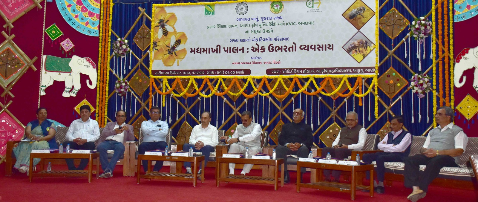 રાજ્યના બાગાયત વિભાગ,આ.કૃ.યુ. પ્રસાર શિક્ષણ ભવન તથા KVIC ના સંયુક્ત ઉપક્રમે આણંદ કૃષિ યુનિવર્સીટીની બી.એ.કોલેજ ઓફ એગ્રીકલ્ચરના ઓડીટોરીયમ હોલ ખાતે મધમાખી પાલન સાથે સંકળાયેલ મધપાલકો માટે “મધમાખી પાલન: એક ઉભરતો વ્યવસાય” વિષયક રાજ્યકક્ષાનો પરિસંવાદનું આયોજન આણંદ કૃષિ યુનિવર્સિટીના કુલપતિશ્રી ડૉ કે બી કથીરિયાના અધ્યક્ષપદે કરવામાં આવ્યું હતું.