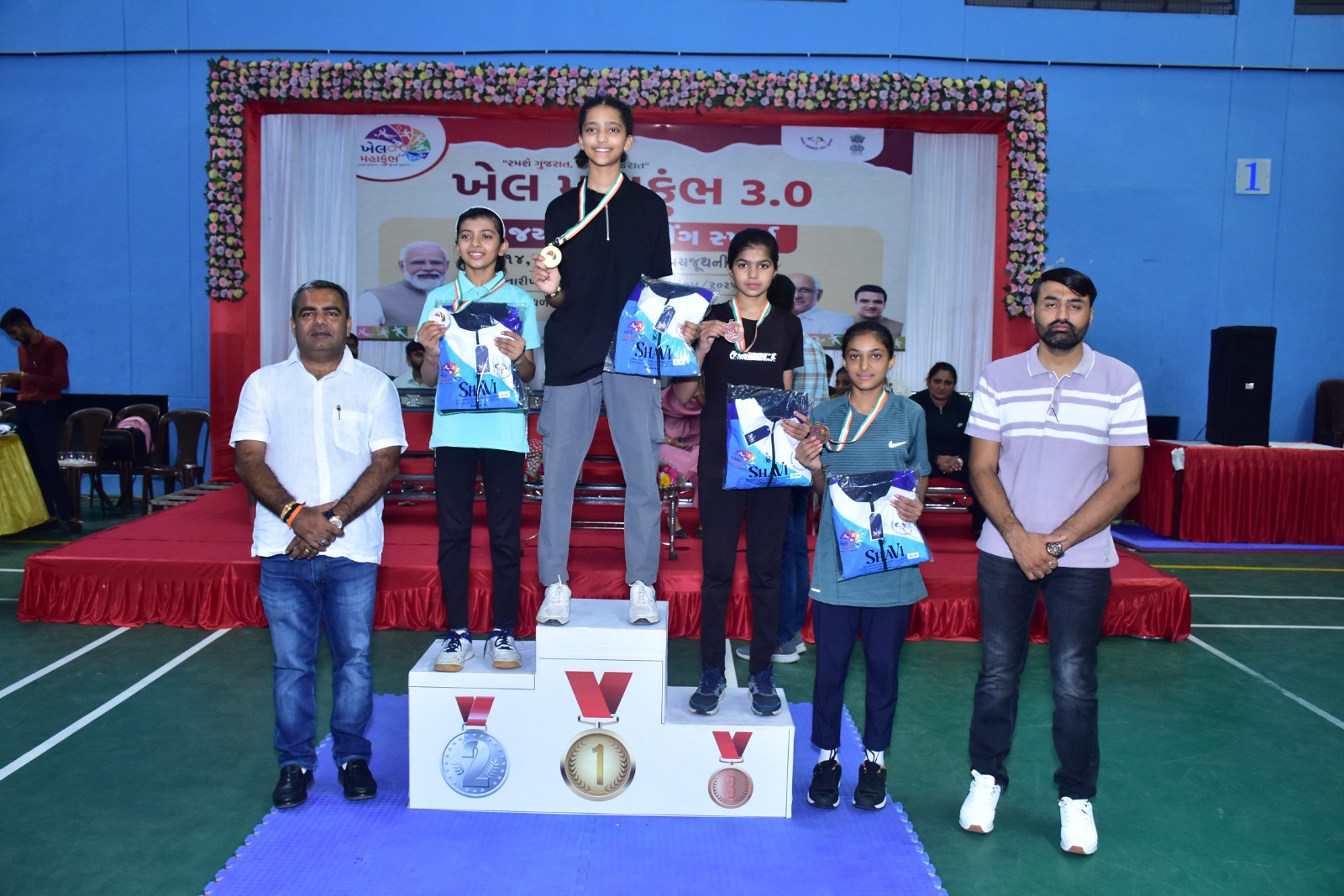આ સ્પર્ધા અંતર્ગત તા.૨૬/૦૪/૨૦૨૫ ના રોજ અંડર-૧૪ વય જૂથની બહેનો માટે યોજાયેલી ત્રણ ઇવેન્ટ ઇપી, ફોઈલ અને સેબરની ફાઈનલ મેચો યોજાઈ હતી. આ રોમાંચક ફાઈનલ મેચોને નિહાળવા અને ખેલાડીઓનું મનોબળ વધારવા ધારાસભ્ય શ્રી દિવ્યેશભાઈ અકબરી, ડેપ્યુટી મેયર શ્રી ક્રિષ્નાબેન સોઢા અને જામનગર મહાનગરપાલિકા રમત ગમત સમિતિના ચેરમેન જીતેશભાઈ શિંગાળા ઉપસ્થિત રહ્યા હતા.