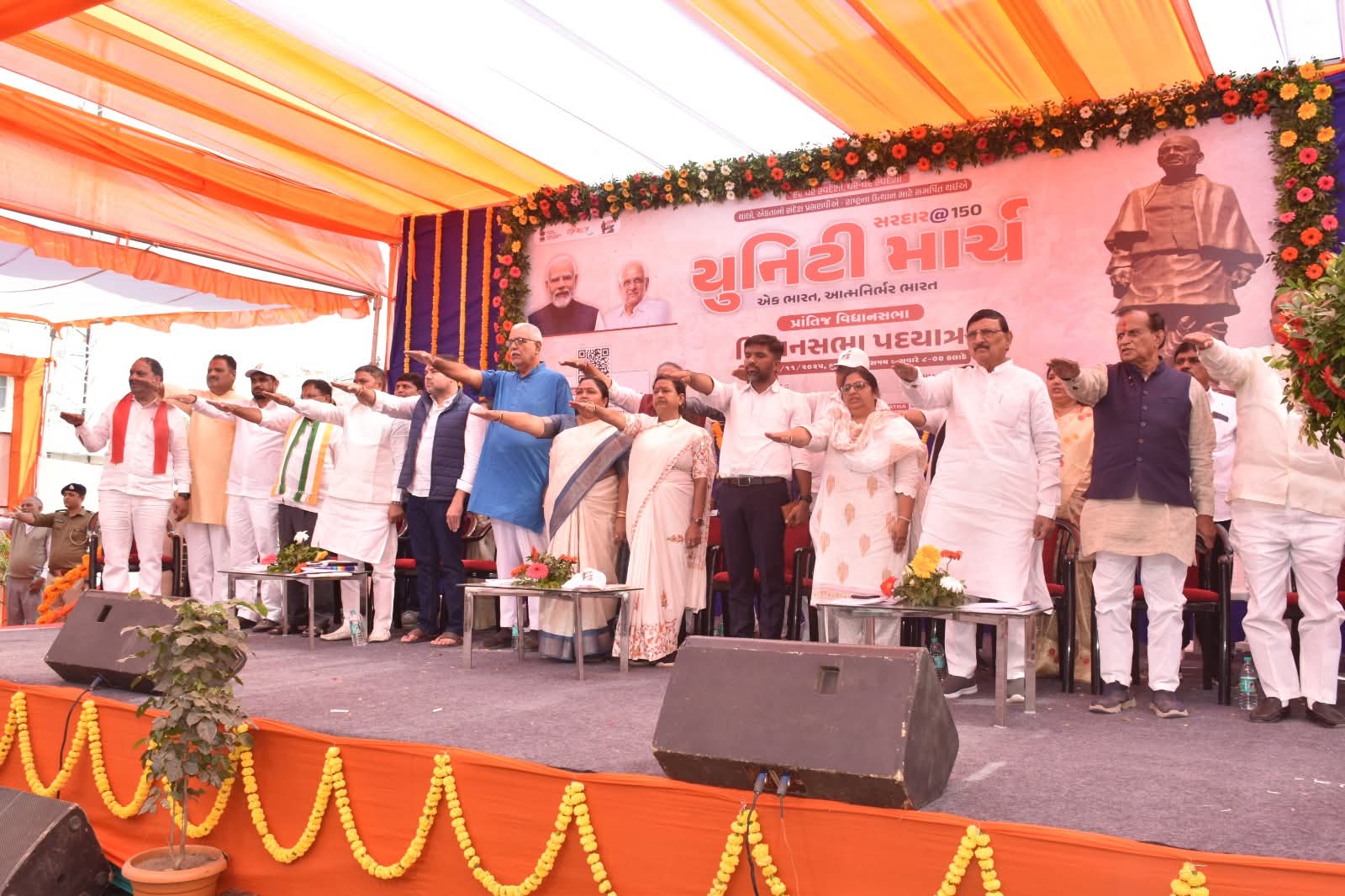 સાબરકાંઠામાં લોહપુરુષ સરદાર વલ્લભભાઈ પટેલની ૧૫૦મી જન્મ જયંતિની ઉજવણીના અવસરે જિલ્લા પંચાયત પ્રમુખ ભારતીબેન પટેલ તેમજ લોકસભા સાંસદ શ્રીમતિ શોભનાબેન બારૈયા , ધારાસભ્ય ગજેન્દ્રસિંહ પરમાર સહિત મહાનુભાવોએ સરદાર પટેલની પ્રતિમાને સુતરની આંટી અને પુષ્ય અર્પણ કરી ‘સરદાર@૧૫૦ : યુનિટી માર્ચ’ પદયાત્રાને પ્રસ્થાન કરાવ્યું હતું.